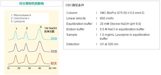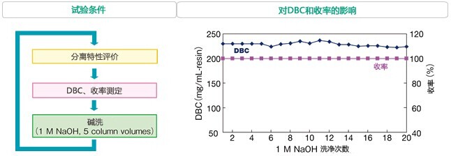 對于蛋白質純化用色譜柱的清洗/殺菌常采用堿性溶液進行定位清洗的方法(CIP:cleaning in place)YMC-BioProl離子交換填料因為具有卓越的耐堿性,所以即使使用1M NaOH實施20次的CIP也能維持高DBC和收率,而不會發生分離特性的改變。