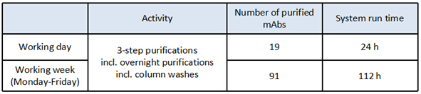 ? ? ? ?Discovery高通量(HT)型系統,采用Protein A - CIEX- Desalting三步向導模塊,每次上樣10 mL單抗上清液(1.0 mg/mL),每次產量均≥6.5 mg。單個樣品的三步純化耗時約為74 min,在24 h內純化出多達19個樣品,而且該時間包含了層析柱的清洗環節。該系統持續運行5天,純化樣品總數量高達91個。