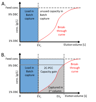 圖2.普通層析和PCC載量利用率對比圖。圖A為批處理上樣。在批處理的捕獲過程中,當樣品出現(xiàn)流穿時,上樣必須結束,從而避免樣品損失。圖B:在2C-PCC連續(xù)上樣階段,第1根層析柱進行上樣,直至出現(xiàn)流穿(例如70%流穿),流穿樣品被第2根層析柱捕獲。因此,第1根層析柱的載量利用率得到顯著提高。
