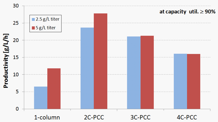 圖3.載量利用率> 90%的多柱位系統(tǒng)產(chǎn)量對比圖。其顯示了典型上樣濃度2.5 g/L和5 g/L的影響結果。2C-PCC比普通批處理和更復雜的3柱位、4柱位設計更具優(yōu)勢。*