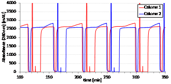 圖4. 2C-PCC系統(tǒng)的每根層析柱都有其專屬的UV檢測器位于柱后。層析柱連接后,第1根層析柱的流出端UV信號,也同樣是第2根層析柱的流入端UV信號(見上圖UV1)。AutomAb? 監(jiān)測第1根層析柱的流出端UV信號并保證mAb持續(xù)上至第2根層析柱。