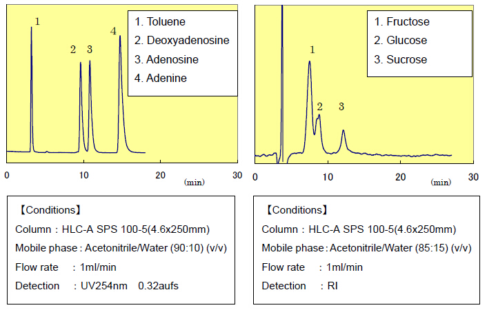 ????因此,對于極性化合物的洗脫,HILIC模式和反相模式是互補的。富士硅化學有限公司開發了兩款HILIC模式的填料,命名為“HLC”硅膠。兩種HLC硅膠都含有兩性的官能團,共價鍵合在硅膠表面。“HLC-A”用于分離純化有機酸、核酸和糖類;“HLC-P”用于分離氨基酸、多肽。