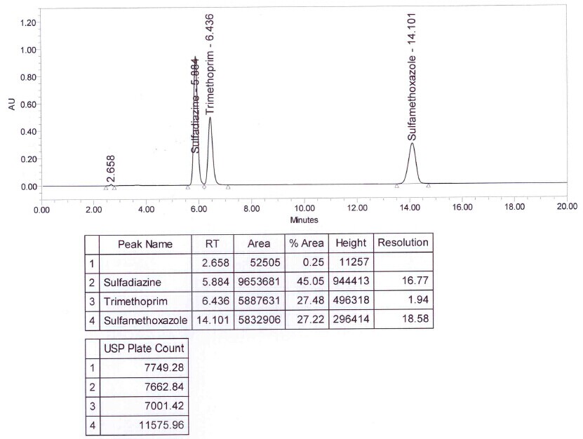 ??? 下圖是用Merck Hibar Purospher STAR LP 柱,使用藥典的方法,對聯(lián)磺甲氧芐啶片中磺胺甲噁唑、磺胺嘧啶和甲氧芐啶含量進(jìn)行測試的譜圖,請參考。