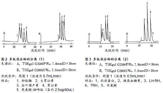 ??? 表2所示為各多肽標準液的洗脫體積,圖1所示為標準曲線。洗脫液采用含有45%乙腈的0.1%TFA溶液。所有TSKgel G2000SWXL的樣品洗脫速度均慢于TSKgel G2500PWXL。同時,在TSKgel G2000SWXL中,肌球蛋白(MW17800)進入填充劑的小孔內部,但在TSKgel G2500PWXL中,肌球蛋白被小孔排阻,從外水體積中被洗脫。根據其結果,可認為TSKgel G2500PWXL在上述洗脫液條件下的多肽分子量排阻界限推測為8000,相比之下,硅膠型填充劑TSKgel G2000SWXL,可適用于從低分子量到高分子量區域更廣的范圍。