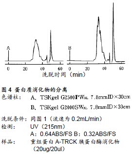 ????圖4所示為分離基因重組ProteinA的TRCK-胰蛋白酶消化物的實例。樣品中含有與蛋白質消化物分子量不同的各類多肽。如上所示,由于TSKgel G2000SWXL色譜柱的分離范圍較寬,其分離效果也更好。(該樣品通過RPC分析的結果,可觀察到約有60種多肽峰在RPC下被檢測到)。