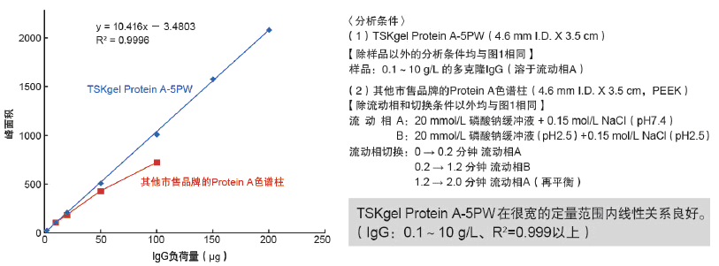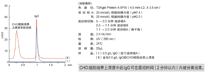 目前,人們對(duì)以免疫球蛋白(IgG)為主的抗體藥物的需求日益高漲。在抗體藥物的研發(fā)以及制備工藝建設(shè)中,由于IgG表達(dá)需進(jìn)行篩選,所以必須快速及準(zhǔn)確地定量細(xì)胞培養(yǎng)液中的IgG。而且,即使在工業(yè)制備過程中,IgG的定量也是重要的質(zhì)量控制項(xiàng)目之一。為此,日本東曹公司特推出以多孔親水性聚合物為基質(zhì),表面鍵合有重組Protein A官能團(tuán)的TSKgel Protein A-5PW親和色譜柱,用于IgG的快速、高分離度分析。