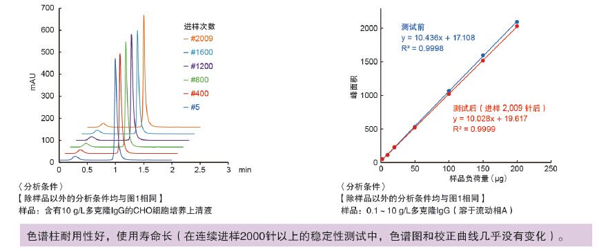 4. 連續(xù)進(jìn)樣測(cè)試中的色譜圖以及進(jìn)樣測(cè)試前后的IgG校正曲線