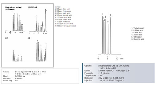 同時(shí),SHODEX公司的KC-811柱和YMC公司的Hydrosphere C18柱,也能同時(shí)分離多種有機(jī)酸。