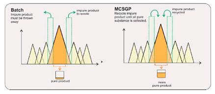 Contichrom層析系統所特有的MCSGP功能(Multicolumn Countercurrent Solvent Gradient Purification),可將目標產物與雜質的重疊部分回收,進行循環式的層析操作,從而最大限度地提純產品,使得純度和收率二者兼得。運行MCSGP功能時,各cycle僅將最純組分收作目標產物,從而保證了高純度;各cycle均將重疊部分進行回收再上樣,從而保證了高收率。