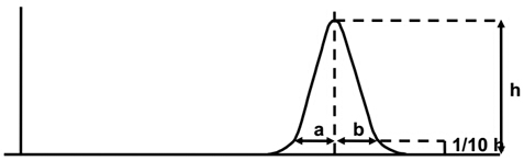 ? ? ??As?=b/a。As >1,說明裝填偏松,表現為峰拖尾;As <1,說明裝填偏緊,表現為峰前沿。若對分離度有較高要求,可把標準定為0.8 <As <1.2;若對分離度要求并不高,可把標準定為0.8 <As <1.5,甚至更寬的范圍。