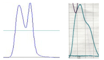 ? ? ? 可能原因:1)柱床中心凹陷,或柱床與篩網之間存有氣泡,導致樣品流動不均勻(樣品需要繞過凹陷區或氣泡);2)裝填不均勻,甚至內部有裂縫;3)篩網堵塞,導致樣品流動不均勻;4)層析柱無分配器,或分配器設計不佳,導致偏流。