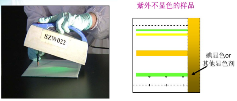 二照:在紫外燈下觀察有無(wú)暗斑或熒光斑點(diǎn)