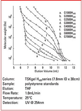 3. Hhr型色譜柱為常規(guī)的GPC色譜柱,尺寸為7.8mm ID x30cm。當(dāng)使用此類常規(guī)色譜柱時,大多數(shù)的HPLC系統(tǒng)無需進(jìn)行針對柱外峰展效應(yīng)的優(yōu)化。