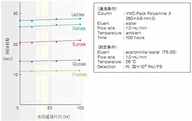 下圖顯示,即使在僅采用水作為流動(dòng)相的困難條件下測(cè)試其耐用性,糖的保留時(shí)間變化也非常小。