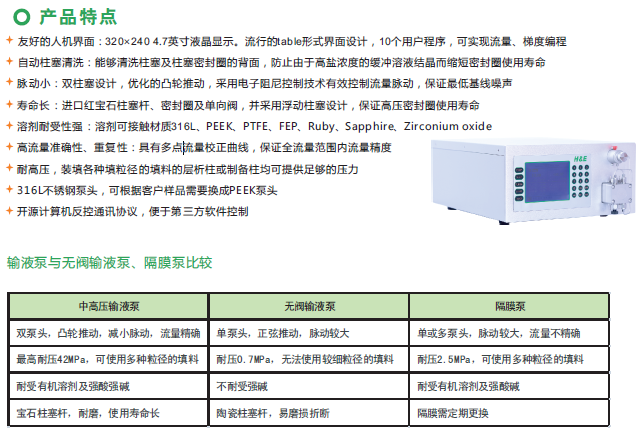 柱塞泵是目前液相色譜主流的輸液單元,特別是雙柱塞往復(fù)泵。它有一個(gè)精心設(shè)計(jì)的偏心凸輪,用同步電機(jī)或變速直流電機(jī)驅(qū)動(dòng)偏心凸輪,偏心凸輪再推動(dòng)兩活塞作往復(fù)運(yùn)動(dòng)。偏心凸輪短半徑端所對(duì)應(yīng)的活塞向外伸,使該活塞的下單向閥打開吸入流動(dòng)相,與此同時(shí),偏心凸輪的長半徑端所對(duì)應(yīng)的另一活塞被推入,使其上單向閥打開,并將流動(dòng)相送至色譜柱。具有操作方便、流速穩(wěn)定、壓力脈動(dòng)小、故障率低的優(yōu)點(diǎn)。