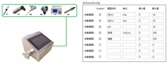 系統提供8路傳感器通道,可接受4~20mA及-10V~+10V的信號輸入,可連接絕大部分類型的傳感器,比如:壓力、溫度、流量、電導、pH、UV等。