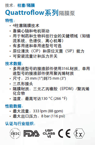 uattroflow的產(chǎn)品需要主要供應(yīng)于密封性好、純度高、無菌的制藥業(yè)和生物技術(shù)產(chǎn)業(yè)。Quattroflow的容積式泵產(chǎn)品采用無機(jī)械密封的四活塞隔膜技術(shù),該泵由一個偏心軸桿及發(fā)動機(jī)驅(qū)動。