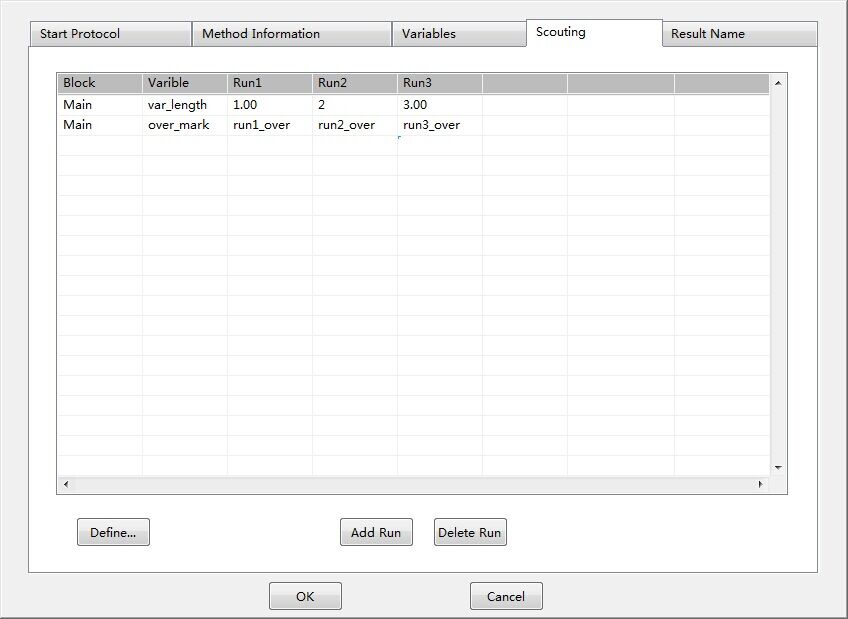 Scouting,即探索功能,通過將方法中的某些參數(shù)編輯成變量,然后通過Scouting設(shè)置,將同樣的方法運(yùn)行多次,每次僅僅是自動(dòng)修改方法中的某個(gè)或某些參數(shù),從而實(shí)現(xiàn)參數(shù)的自動(dòng)尋優(yōu),譬如尋找最適合的流速、尋找最適合的裝柱高度等。