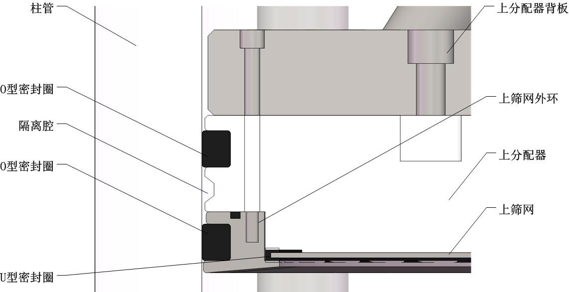 層析柱密封結(jié)構(gòu)主要考慮密封的可靠性、有效面積最大化和死體積的最小化三個方面。柱頭的密封形式如下圖所示,柱管與移動的柱頭之間采用雙層O型密封圈進(jìn)行密封,起到雙重密封的作用。