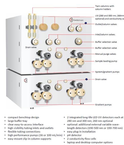 Contichrom層析系統,已由2004年的6-8柱位設計、2006年的3柱位設計,發展為最優化的2柱位設計,可運行多種層析模式,如標準批處理過程、MCSGP(多柱逆流溶劑梯度純化)、N-Rich等,實現了層析新技術與層析系統軟硬件設計的完美結合,使得設備成本更低,構造更為簡化,并可使層析填料、緩沖液等成本投入大為節省,同時也使得純化周期大為縮短。