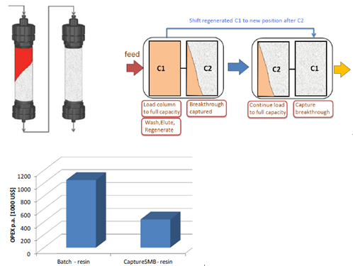 傳統層析工藝,由于流穿效應,有30-50%的填料是無法被完全利用的,從而使得載量和處理量大為受限。Capture SMB用于優化捕獲環節,作為最簡單和最強大的2柱位設計,可使純化效率顯著提高,并且使填料用量大為縮減。