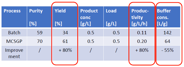 有案例證明,MCSGP可將產品純度從傳統工藝的59%提升至70%,將收率從傳統工藝的34%提升至61%,從而使產量(g /L /h)整體提升80%,并同時使Buffer的消耗量降低55%。MCSGP工藝,無疑可顯著地節約成本投入,并可產生更多的生產效益。