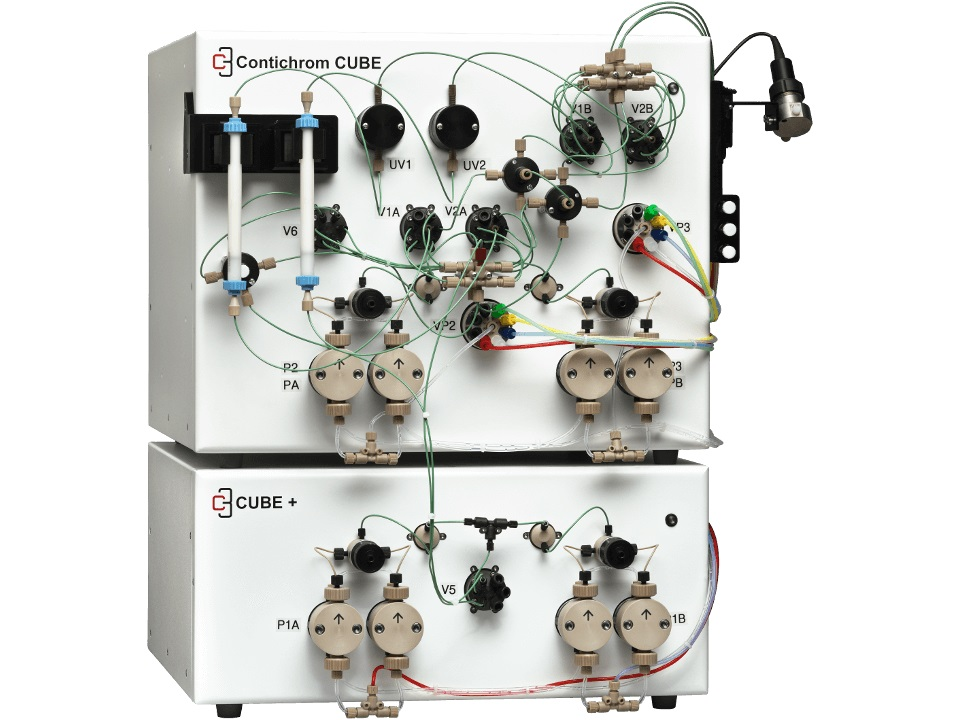 所有的Contichrom系統可以將兩個層析步驟(例如捕獲和精純)整合為一個單一的過程,第一步層析洗脫的產物可以直接被稀釋,從而直接進行第二步層析,因此省略了中間的間歇過程,這是非常適用于高生產量純化的。