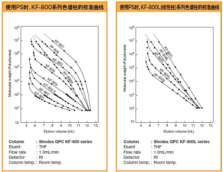 GPC KF-805L是標準的油溶性SEC色譜柱,適用于從低分子量到高分子量的寬范圍的樣品。GPC KF-805L色譜柱是適合分子量分布廣的樣品的混合填料色譜柱。流動相是THF。