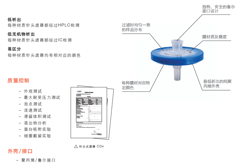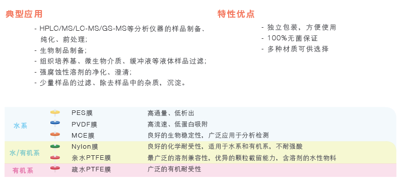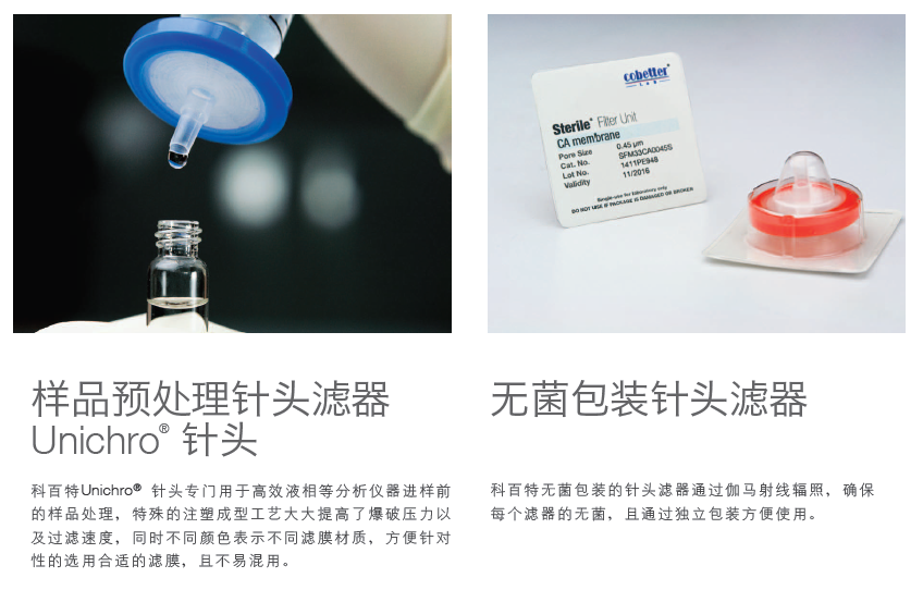 科百特針式過濾器采用PES/PCDF/Nylon/親水PTFE/GF等濾材,以過濾不同性質的物料,設計采用超聲波焊接技術,減少使用時從側面漏液的風險,同時每個針頭根據(jù)膜材質的不同而采用不同顏色標注,為您提供高效、快速的過濾選擇!