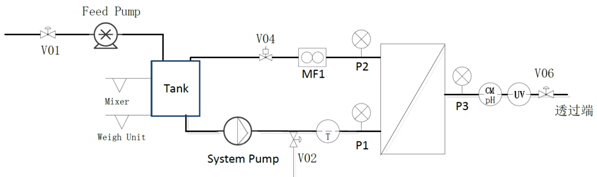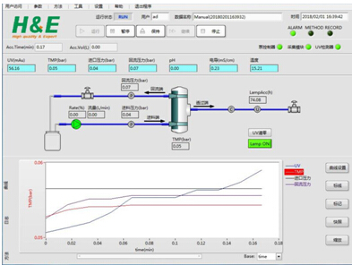 2) The alarm values of feed pressure, TMP and UV at the penetration end can be set. If the alarm value is out of the range, the pump can be stopped to prevent the loss of the target and ensure the process controllability.