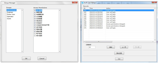 The system adopts five levels of user management authority, which can be assigned by users themselves, and users can be changed during operation (convenient for shift handover). Perfect audit tracking and electronic signature functions, in line with CGMP regulations.