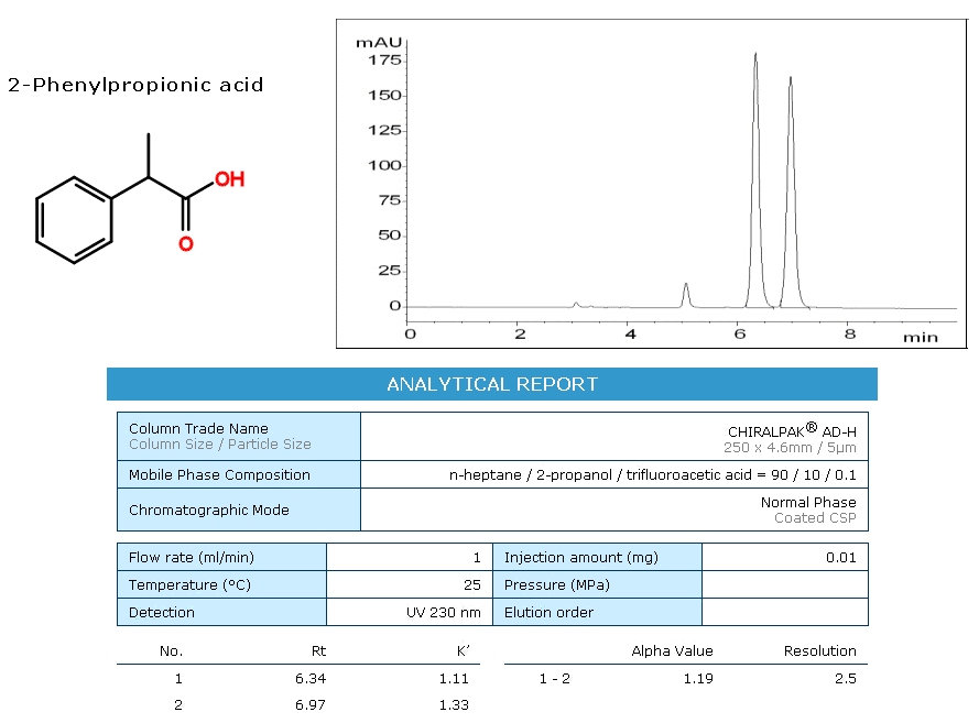 AD為多糖衍生物正相涂敷型手性色譜柱,硅膠表面涂敷有直鏈淀粉-三(3,5-二甲基苯基氨基甲酸酯)。AD為目前世界上使用范圍最廣的一種手性填料,在各類文獻中都報道了AD柱優秀的分離能力和耐受性。CHIRALPAK?AD-3 / AD-H /?AD適合在正相流動相中使用提供不同規格的常規分析柱,內徑為2.1mm的微徑柱,及不同內徑粗細的半制備柱、制備柱,您可根據實驗需要選擇合適的規格。