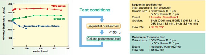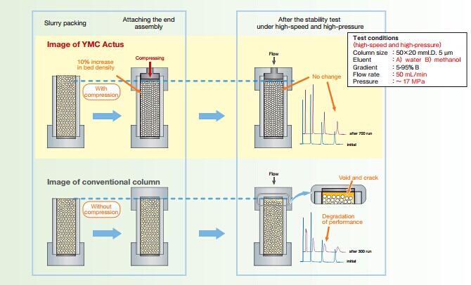 1. 應用動態軸向壓縮柱技術的制備用填充柱,在柱端裝備時進行適度加壓。因此,裝填密度比過去的產品約上升10%。