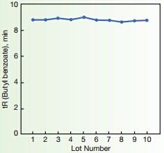 ??? 上圖顯示了疏水性作用的10批生產的批間再現性,這是色譜柱的基本參數,通過對生產過程的嚴格控制,獲得極穩定的批間再現性。其顯示了非常高的批次間重復性,在分析丁苯時候,以10批柱子的數據為例,保留時間的標準偏差小于1.5%,這數據大大低于普通的C18色譜柱。分析標準物質時,每根色譜柱的理論塔板數可達18600,壓力為2600psi